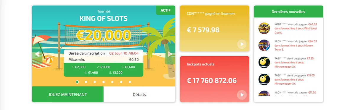 | Slots Vidéo | Play'n GO, Pragmatic Play | 5+ rouleaux, bonus interactifs |