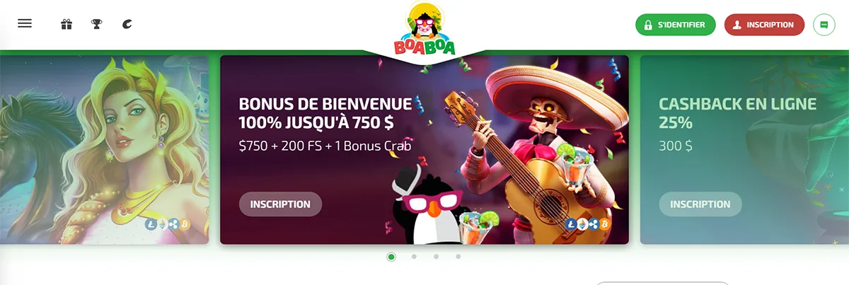 BoaBoa Casino en ligne vous accueille dans un univers de divertissement depuis 2017. Nous offrons plus de 6 000 jeux avec un bonus de bienvenue de 100% jusqu'à 500€ plus 200 tours gratuits. Notre plateforme, exploitée par Rabidi N.V. sous licence Curaçao, dessert plus de 25 pays avec une sélection impressionnante de machines à sous, jeux de table et casino en direct.