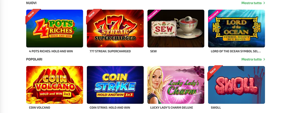 La nostra collezione di slot include titoli dai migliori fornitori del settore. Offriamo giochi da NetEnt, Microgaming, Play'n GO e Pragmatic Play.