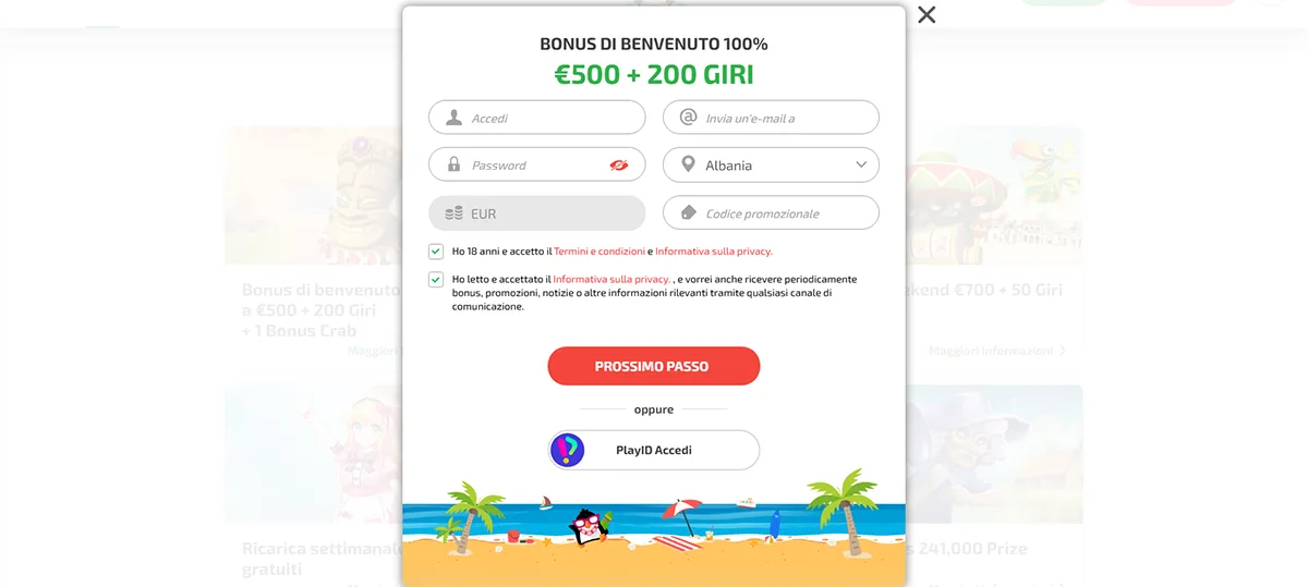 Le nostre offerte esclusive includono un generoso bonus di benvenuto fino a €500 con 200 giri gratuiti e la speciale funzione Bonus Crab. Offriamo anche promozioni ricorrenti come bonus di ricarica del weekend, cashback settimanale e tornei regolari.