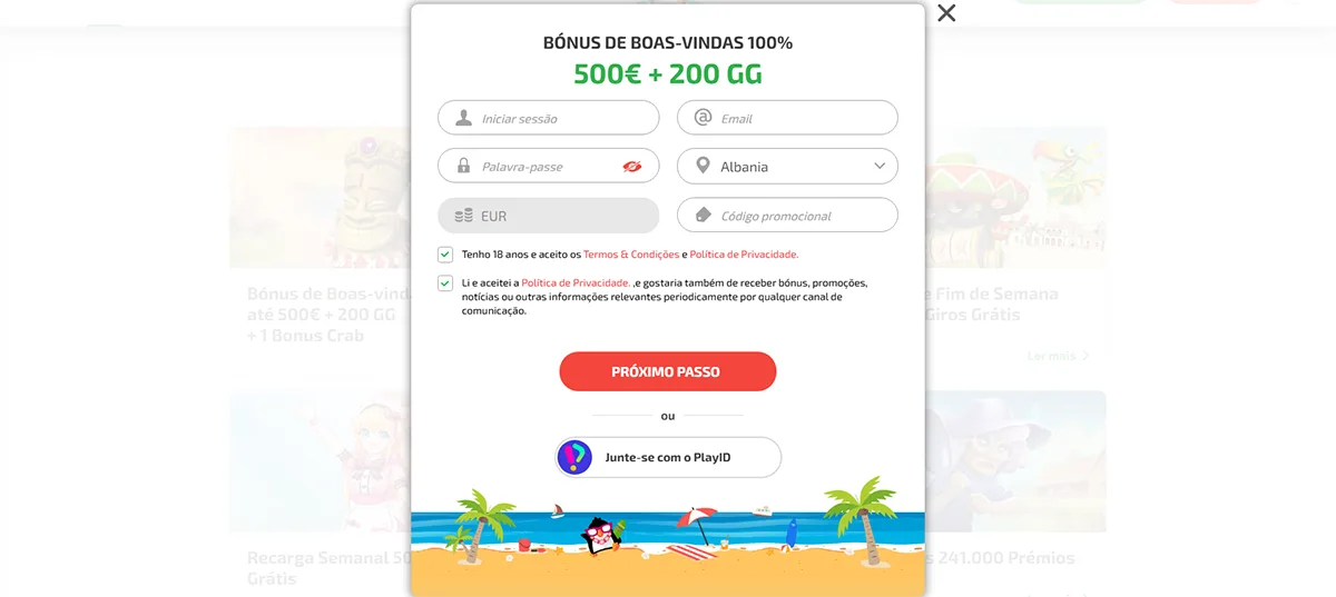 Nosso pacote de boas-vindas oferece 100% até €500 + 200 rodadas grátis no primeiro depósito. Este bônus possui requisitos de apostas de 35x, aplicáveis tanto ao valor do bônus quanto aos ganhos das rodadas grátis.